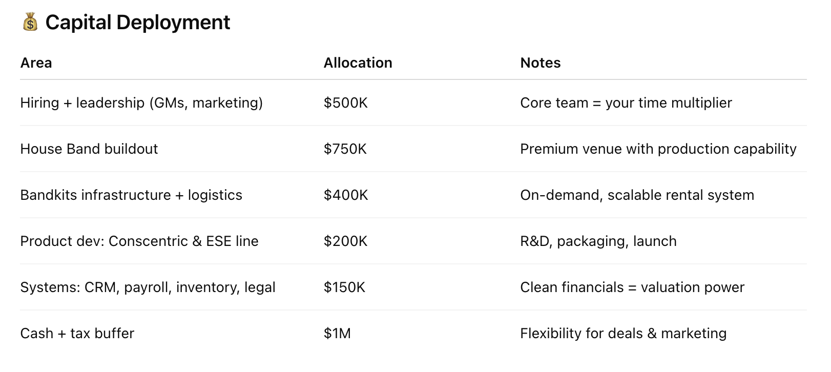 Equity value (5x avg EBITDA across ventures): $12Mβ$15M